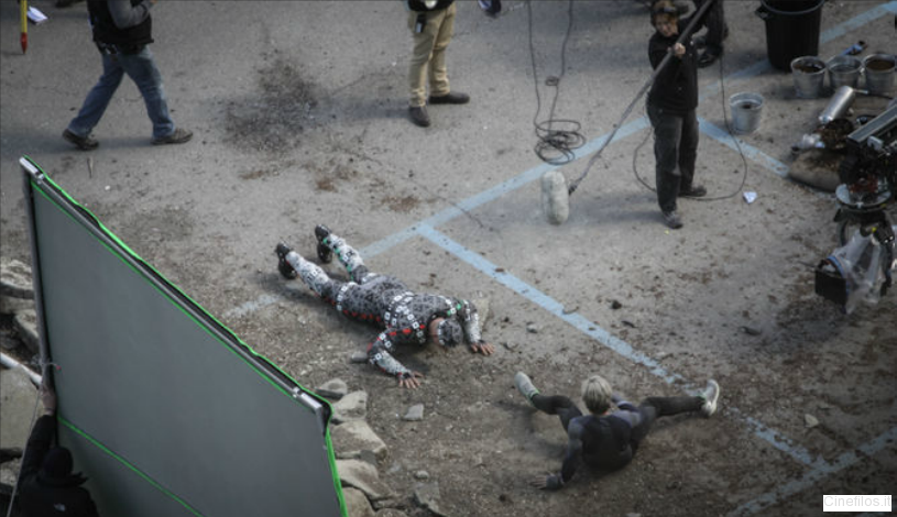 Všichni společně bojují v nějaké masivní bitvě, ve které uvidíme i samotného Ultrona! Ten je na place pouze v provizorním kostýmu, stejně jako herci v motion capture oblecích - to určitě budou přisluhovači Ultrona. Celá scéna je poseta troskami budov, vraky automobilů, autobusů a občas proběhne nějaký ten komparzista z řad obyvatelstva. Pokud budete všímaví, zahlédnete v kšiltovce a s šálou kolem krku i režiséra Josse Whedona nebo současnou verzi Iron Manova obleku.