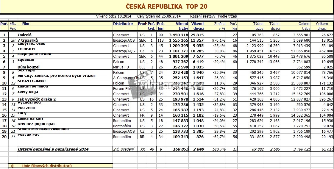 Přikládáme také přehled návštevnosti českých kin podle Unie filmových distributorů za období 25. září - 2. října: