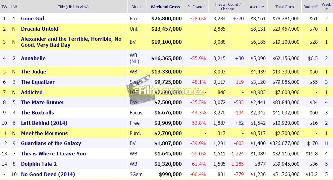 Příští týden to bude mít Zmizelá s obhajobou prvního místa podstatně složitější, protože do kin vstoupí válečný snímek Fury (Železná srdce) s Bradem Pittem v hlavní roli. Za zmínku stojí ještě animák The Book Of Life, který produkuje Guillermo del Toro.