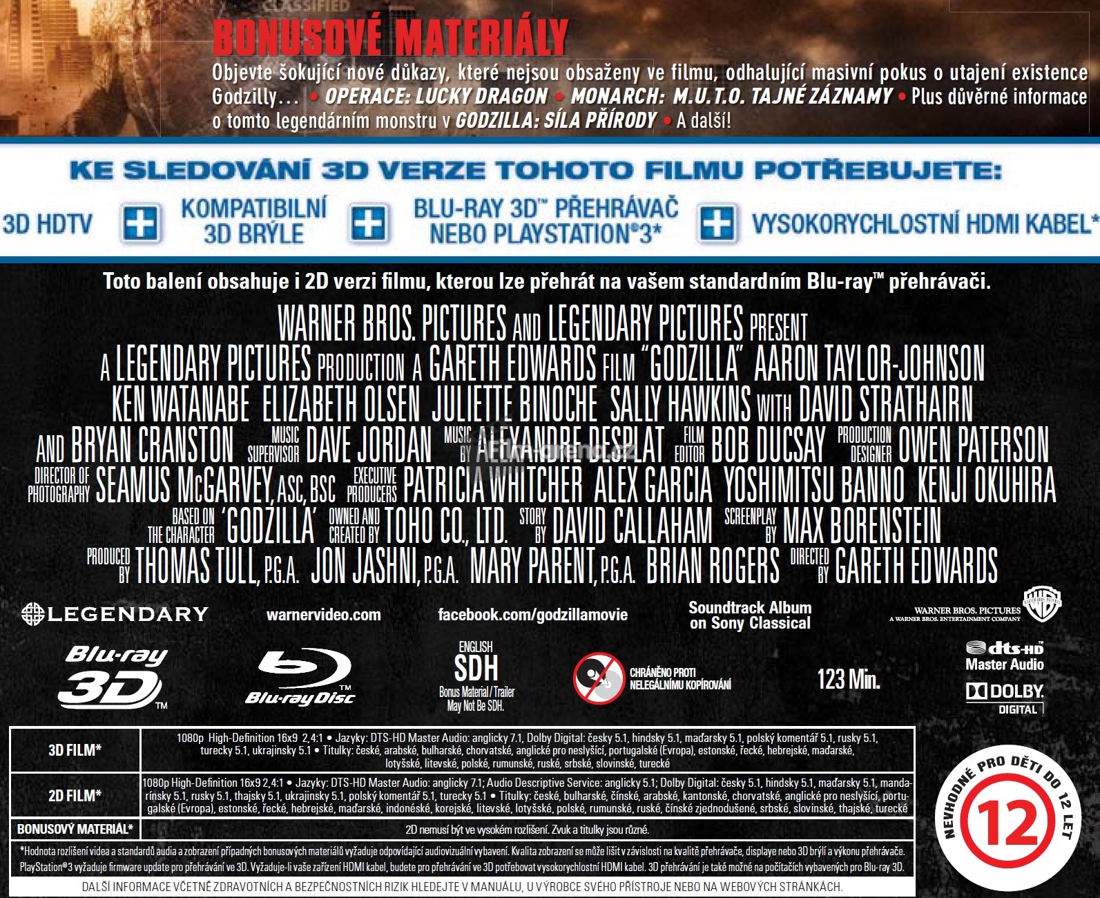 Godzilla naše domácí kina rozdrtí hned ve čtyřech edicích, ze kterých bude pro sběratele asi neatraktivnější dvoudiskový Futurepak v kombinaci 3D+2D disku a embosovaným hřbetem Godzilly. Dále to pak bude jednodiskový a dvoudiskový Amaray a nesmíme zapomenout ani na DVD. Edice se od sebe odlišují rozdílnými artworky, které jsou velice originální a stejně jako ve filmu samotném na nich máme Godzillu docela zahalenou, což působí tajemně. Za poskytnuté náhledy a veškeré specifikace děkujeme label manažerovi studia Warner Bros. Lukáši Kreisovi.