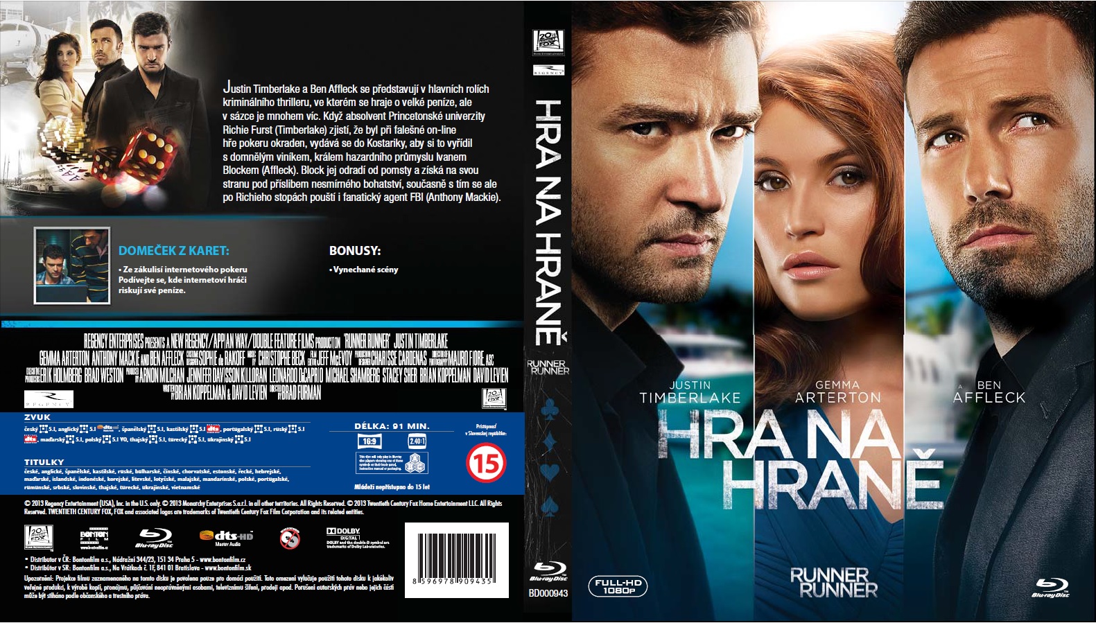 Jistě si kladete otázku v jaké podobě dorazí na náš trh Blu-ray disk s tímto filmem, takže se na něj pudeme podívat. Na přední straně obalu vidíme všechny hlavní herecké hvězdy a velkým písmem je zde český název filmu. Ve spodní částí najdeme menším písmem název originální. Tento motiv vychází z kinoplakátu a je poutavý. Dobrou tradicí Bontonfilmu je vnitřní artwork, na kterém po levé straně vidíme Bena Affleca a Justina Timberlakea, prává část zabírá okolí, ale to vůbec nevadí, protože na ní bude umístěn disk. Upoornění o autorských právech není v červeném pruhu, takže v tomto případě panuje naprostá spokojenost. Na hřebetu je taktéž velkým písmem český název filmu a menším originální. Můžete si na něm všimnout i znaků hracích karet. Sice je to drobnost, ale tyto detaily potěší.