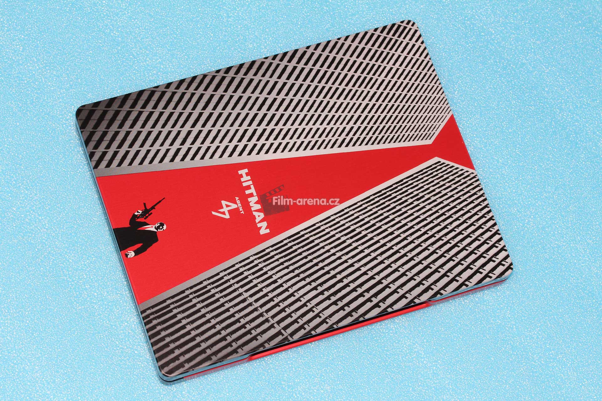 Tento Steelbook je pojat značně umělecky, takže se po delší době bude jednat o opravdu originální kousek. Plíšek je matný, takže by na něm neměly být vidět otisky prstů a základem je červená barva, jenž by měla symbolizovat krev (a také tvoří obrazec kravaty). Na přední straně ji moc nevidíme, protože zde hlavní prim tvoří dvě výškové budovy. Máme zde samozřejmě také název filmu Hitman: Agent 47, pod kterým je vyobrazena postava tohoto legendárního zabijáka.