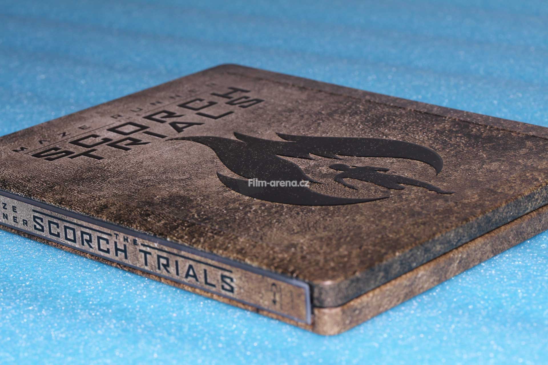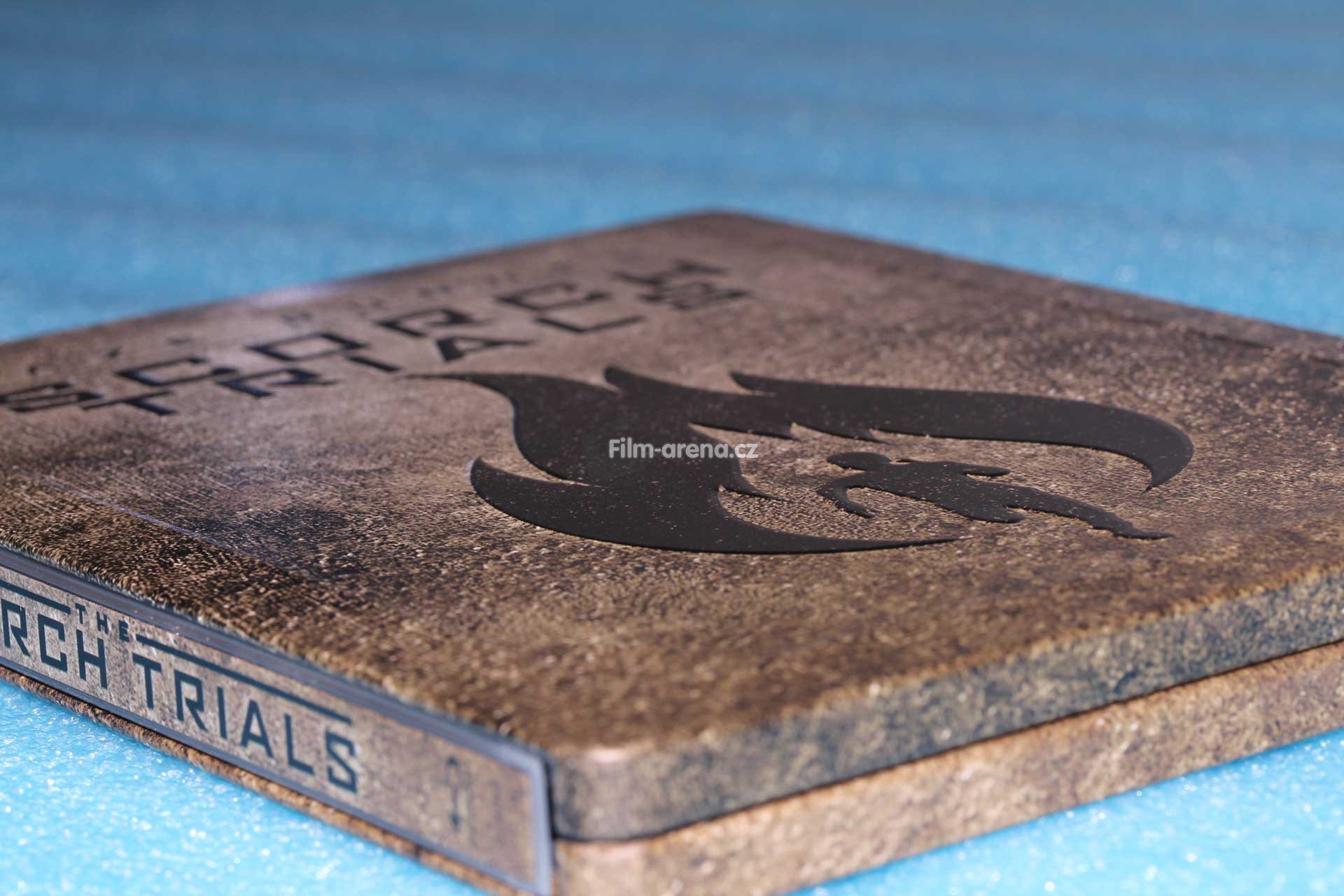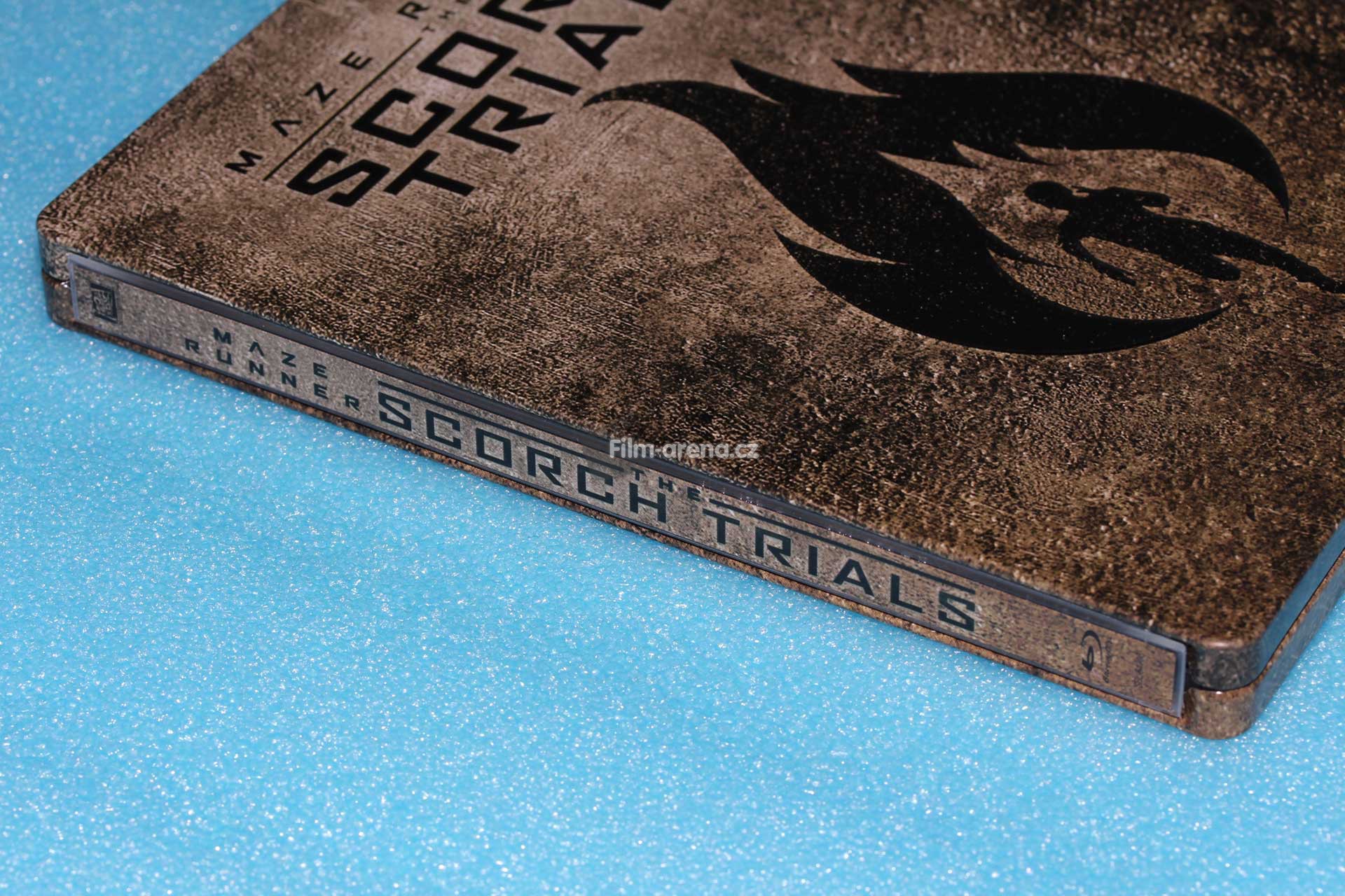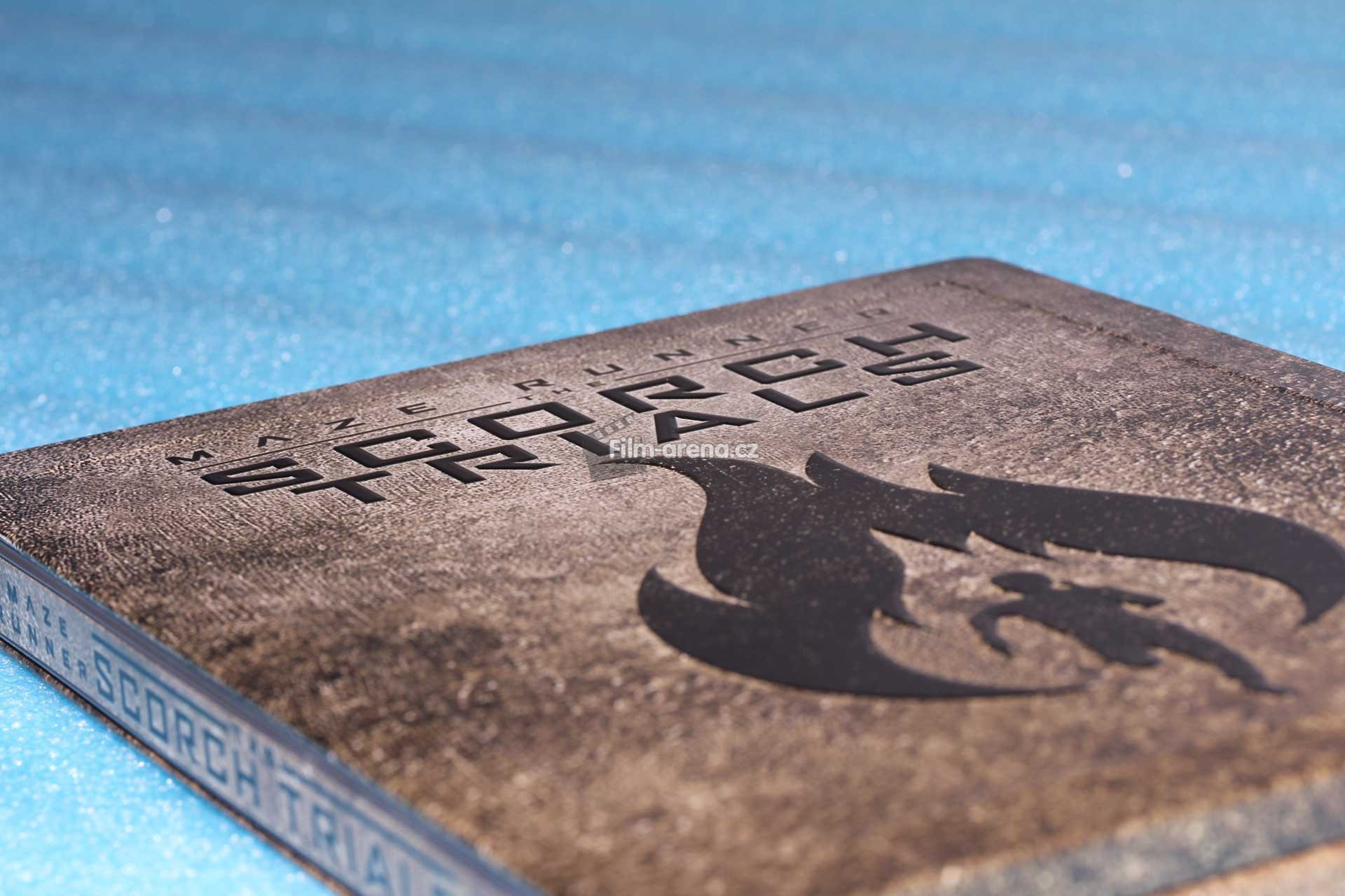 Pokud se ovšem na tento plech podíváte pod různými úhly, tak Vám z něj vystoupí podtitul filmu Scorch Trials a logo, které je dominantou přední strany Steelbooku. Tyto embossované prvky jsou velmi povedené a nejvíce zřejmé po přejetí prstem.