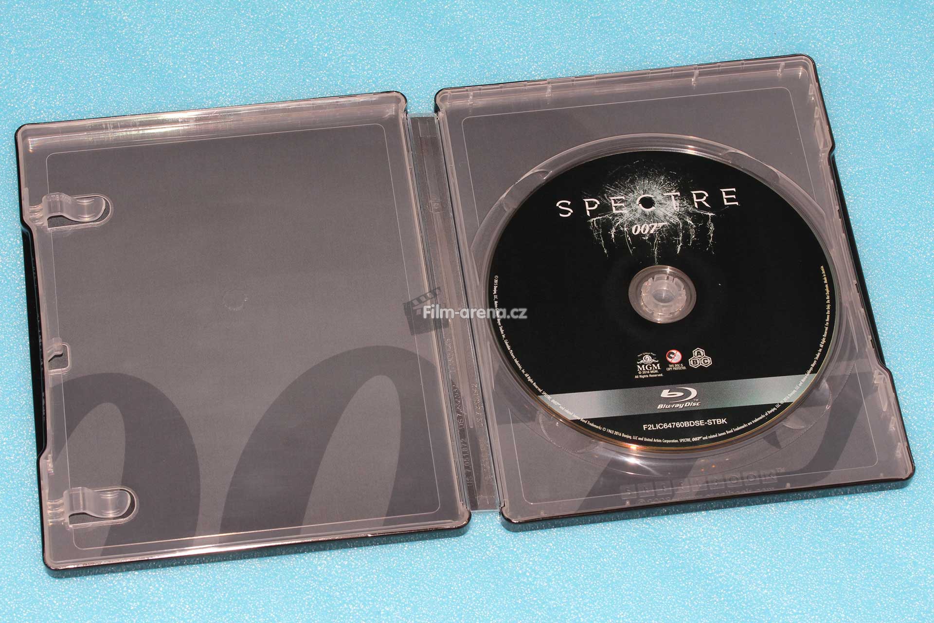 Po rozevření na nás vykoukne Blu-ray disk s černým potiskem na pozadí a patřičnými popisky. Studio pravděpodobně chtělo, aby celé toto balení bylo koncepčně uhlazené, protože Blu-ray disk v klasickém amarayi má potisk jiný. Vnitřní artwork navazuje na nedávno vydané Steelbooky starších bondovek, takže je v jednobarevném provedení a ve spodní části vidíme oříznutou číslovku 007.