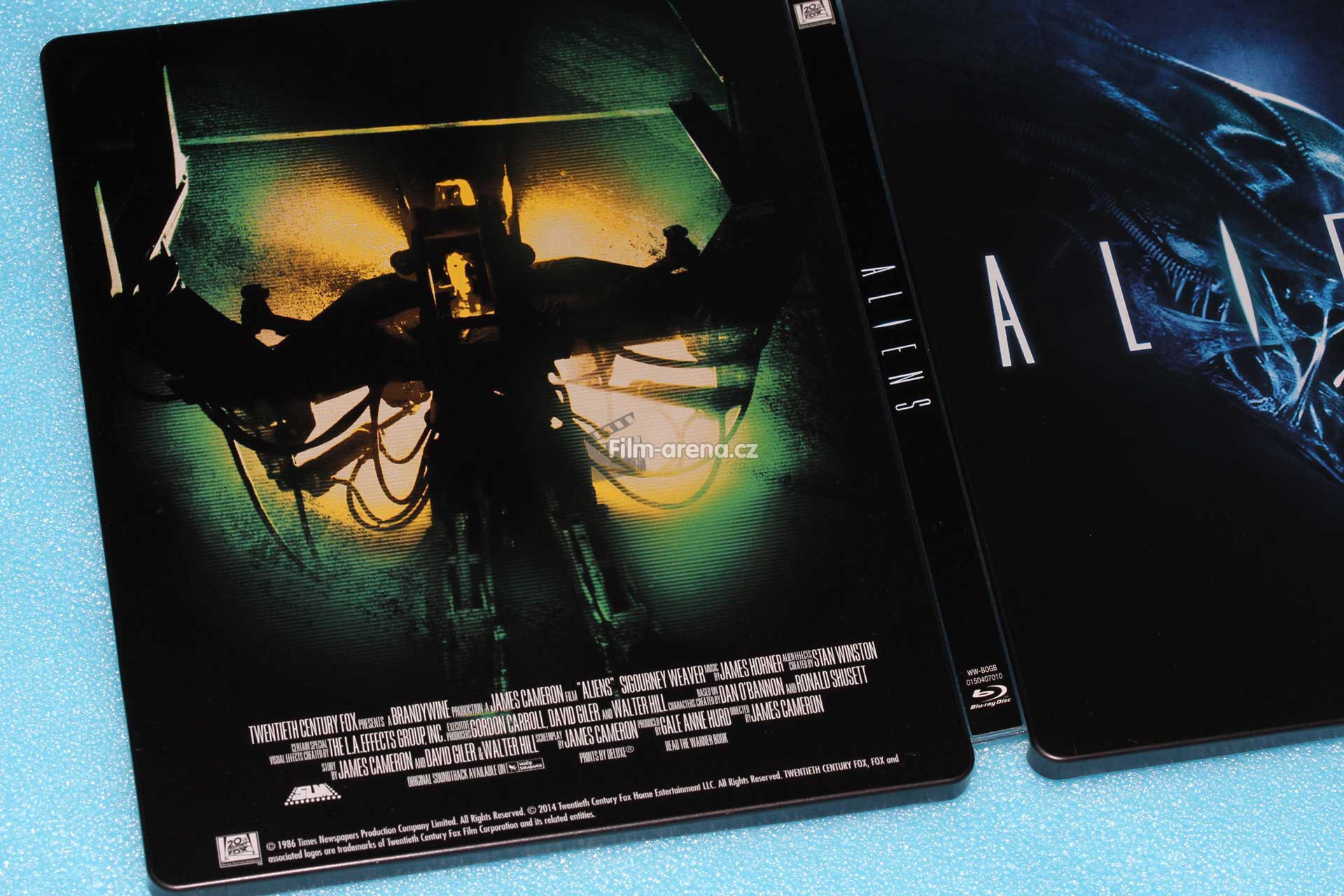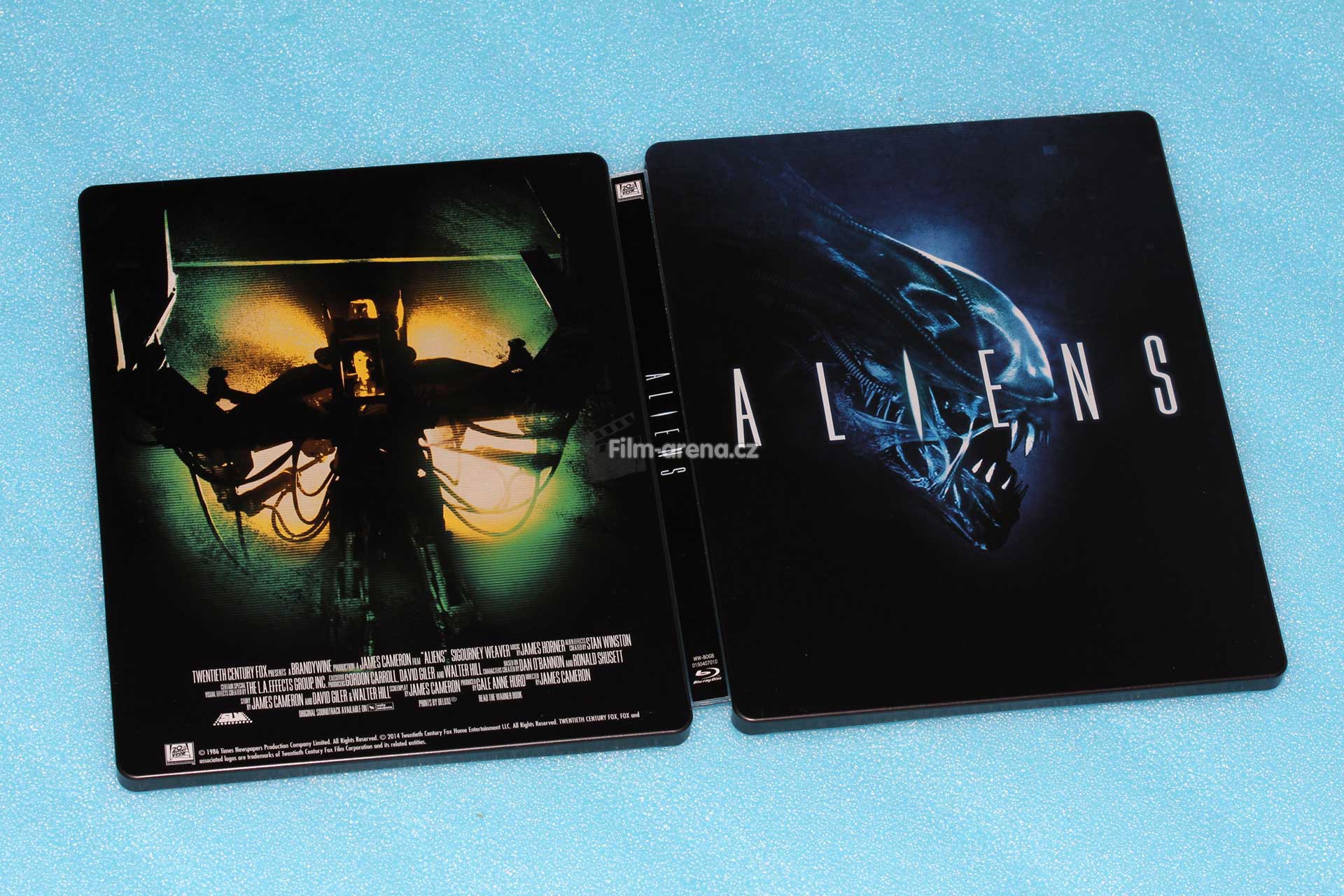 Steelbook má černé pozadí a jeho povrchová úprava je matná. Bohužel zde oproti předchozím kouskům nenajdeme žádný emboss nebo deboss. Hlavní prim hraje hlava Xenomorfa s vytasenými zuby ve fialovém barevném nádechu a přes něj je vyobrazen originální název filmu - Aliens.