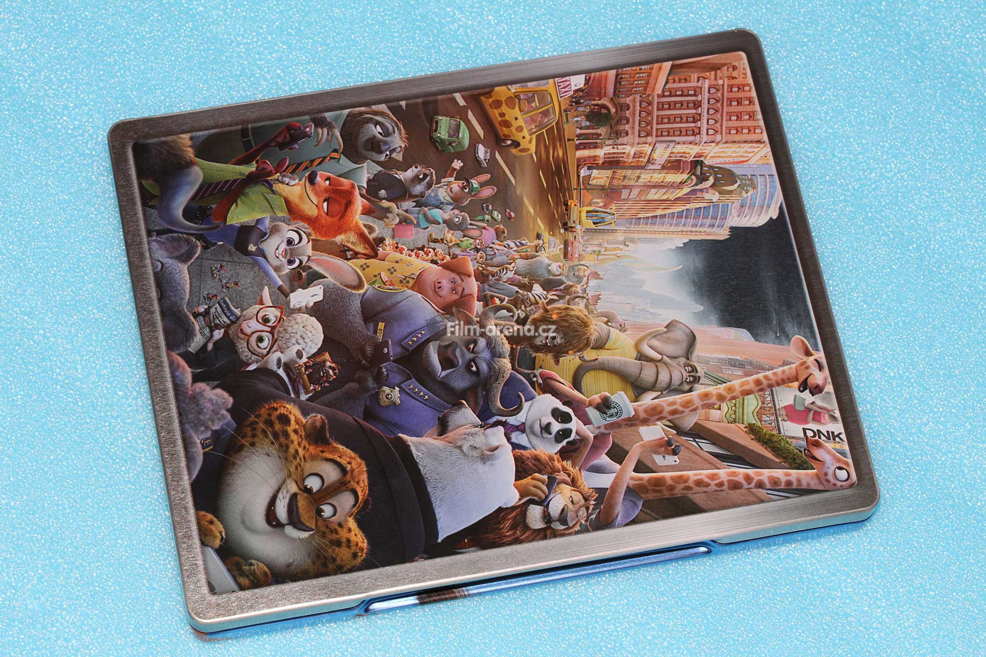 Plech je v lesklém provedení, ale díky barevným podkladům na něm prakticky nejdou vidět otisky prstů, které jsou vždy nepříjemné. Přední motiv vychází z kinoposteru a najdeme na něm záběr na obyvatele Zootropolis. Nechybí na něm samozřejmě ani Judy Hopkavá a mazaný lišák Nick Wilde. Přední strana je ve stříbrném rámečku, jedná se ovšem pouze o grafický prvek, takže zde není žádný deboss nebo emboss.