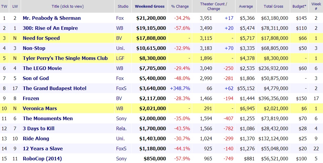 Třetí příčka patří první novince. Tou je adaptace slavné herní série Need for Speed. Film byl při svém startu nasazen do více jak 3000 kin, z kterých dokázal vydolovat necelých 18 mega. Jde poněkud o zklamání, protože se jedná o ještě nižší otvírák než výdělečně nejhorší díl ze série Rychle a zběsile: Tokio Drift. Need for Speed se tak v rámci herních adaptací nachází na stejné úrovni jako první Resident Evil nebo Max Payne. Do výdělků určitě dosti razantně promluvili i celkem nepřívětivé recenze, které o filmu mnohdy mluví jako o nudném, částečně přihlouplém a nezáživném ,,adrenalinovém“ závodění. Do budoucna to tedy s další herní adaptací nevypadá příliš růžově. Celkové tržby se ze severoamerického kontinentu pravděpodobně nedostanou na více jak 50 miliónů a to je přeci jen trochu málo, když si vezmeme, že studio plánovalo plnohodnotnou konkurenci pro Rychle a zběsile. Když divákům nemáte moc co nabídnout, tak se ve finále není čemu divit.