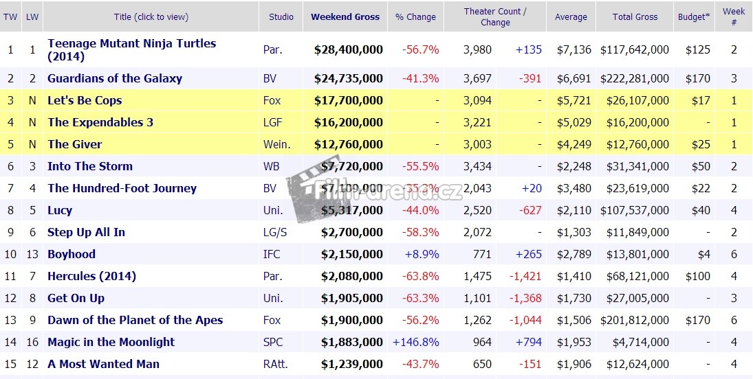 Želvy jsou super překvapením, EXP3 bohužel zklamáním, ale v Americe jsem to trošku čekal. Až svět dá ostrým hochům vydělat. Myslím si, že hodně dobrá čísla vydělala LUCY a hodně spokojení budou u Marvelu se STRÁŽCI GALAXIE, kteří se prý povedli. Dost zvědavý jsem na Dárce...