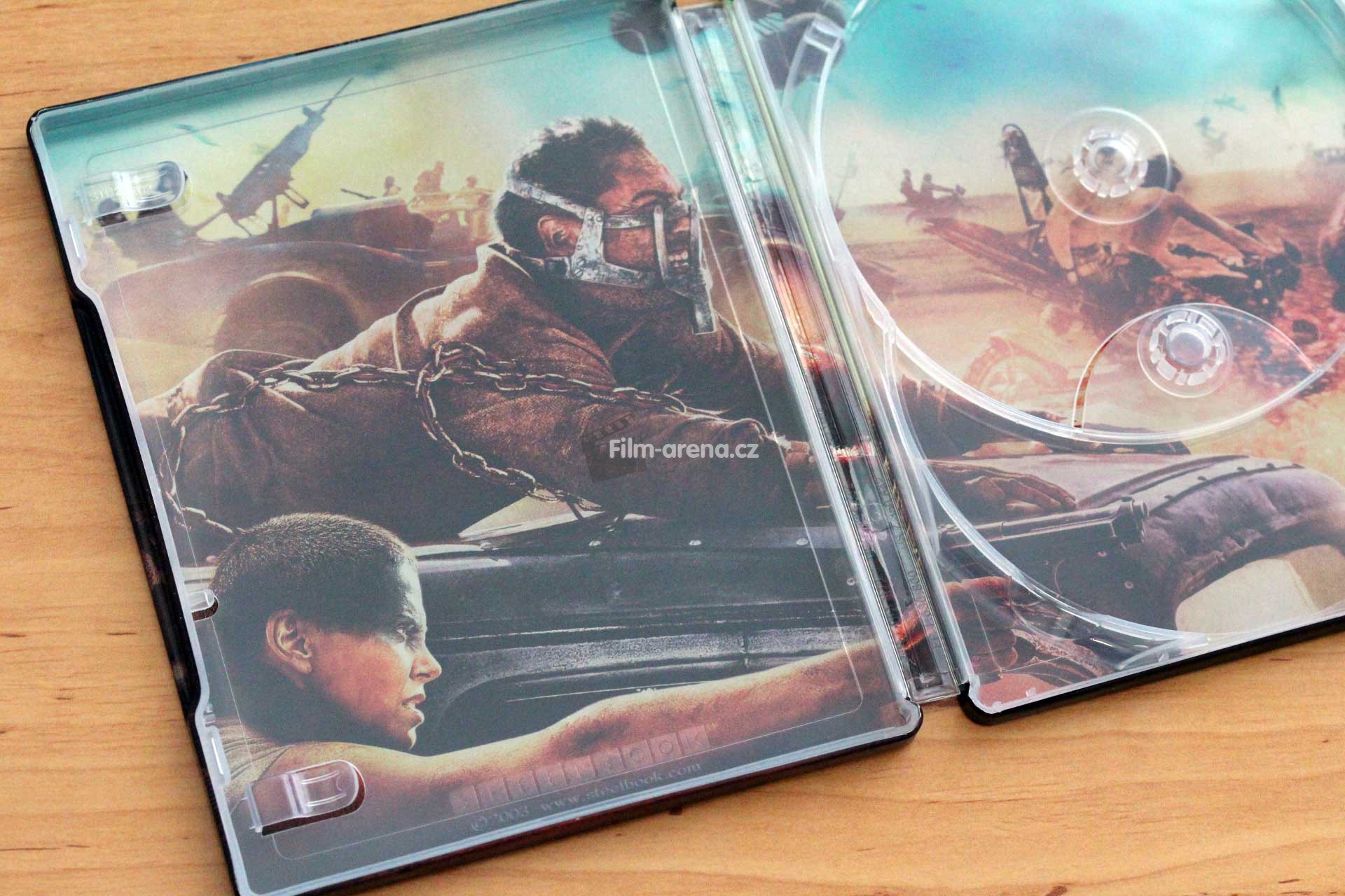 Samotný plech je stejně jako celý film prosáklý pestrými a teplými barvami. Což je rozhodně jedna z věcí, která tento snímek odděluje od ostatních postapokalyptických snímků. Ty se většinou zaměřují na studené a tmavé barvy. Přední strana Steelbooku je přímo epická a je v ní zachycena podstata celé Mad Max série. Jeden muž proti zbytku světa. Max na straně jedné a celá armáda na straně druhé. Max je k nám otočen zády a hledí na naprosto ohromující kolos v podobě vozového parku Immortan Joa.