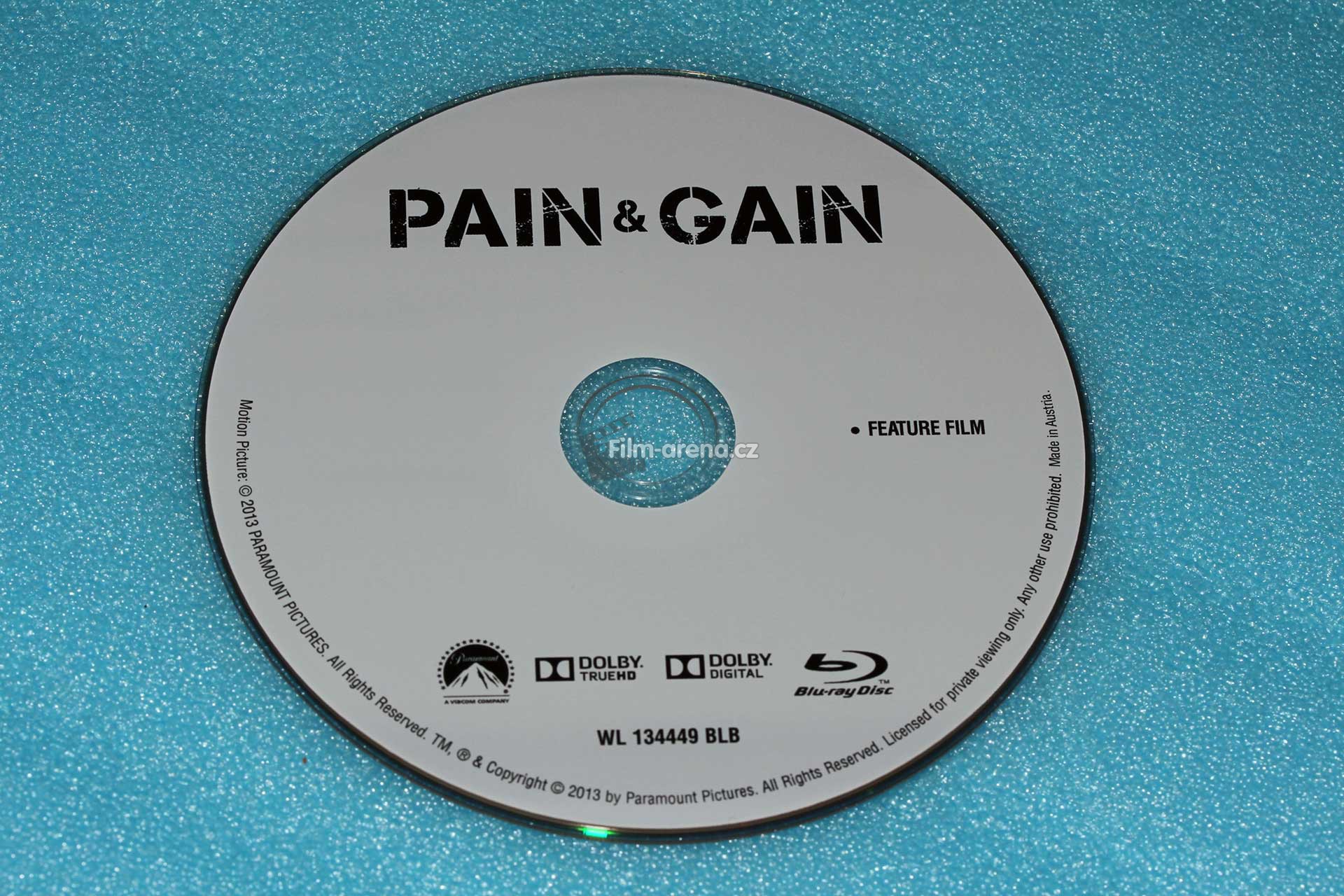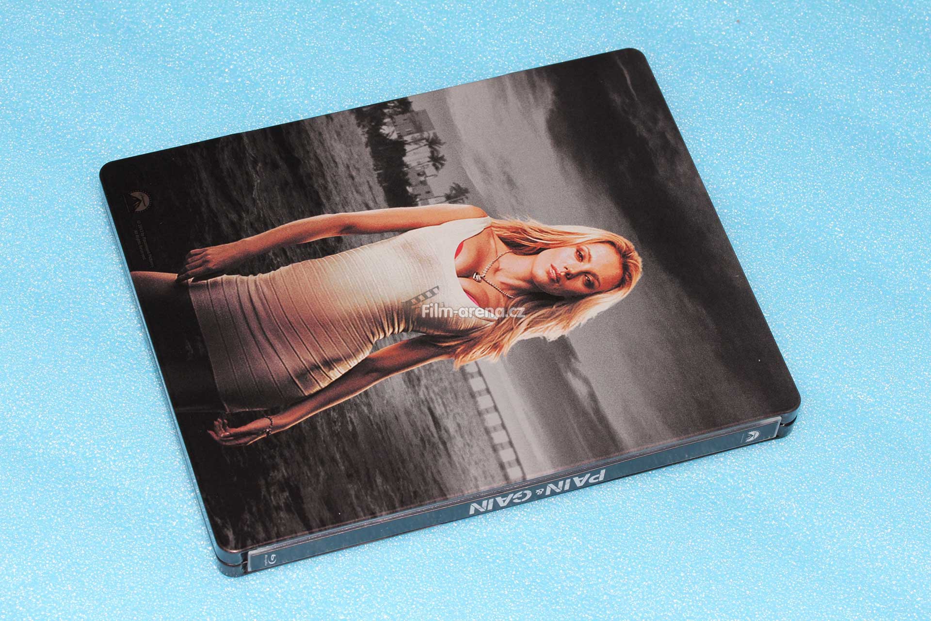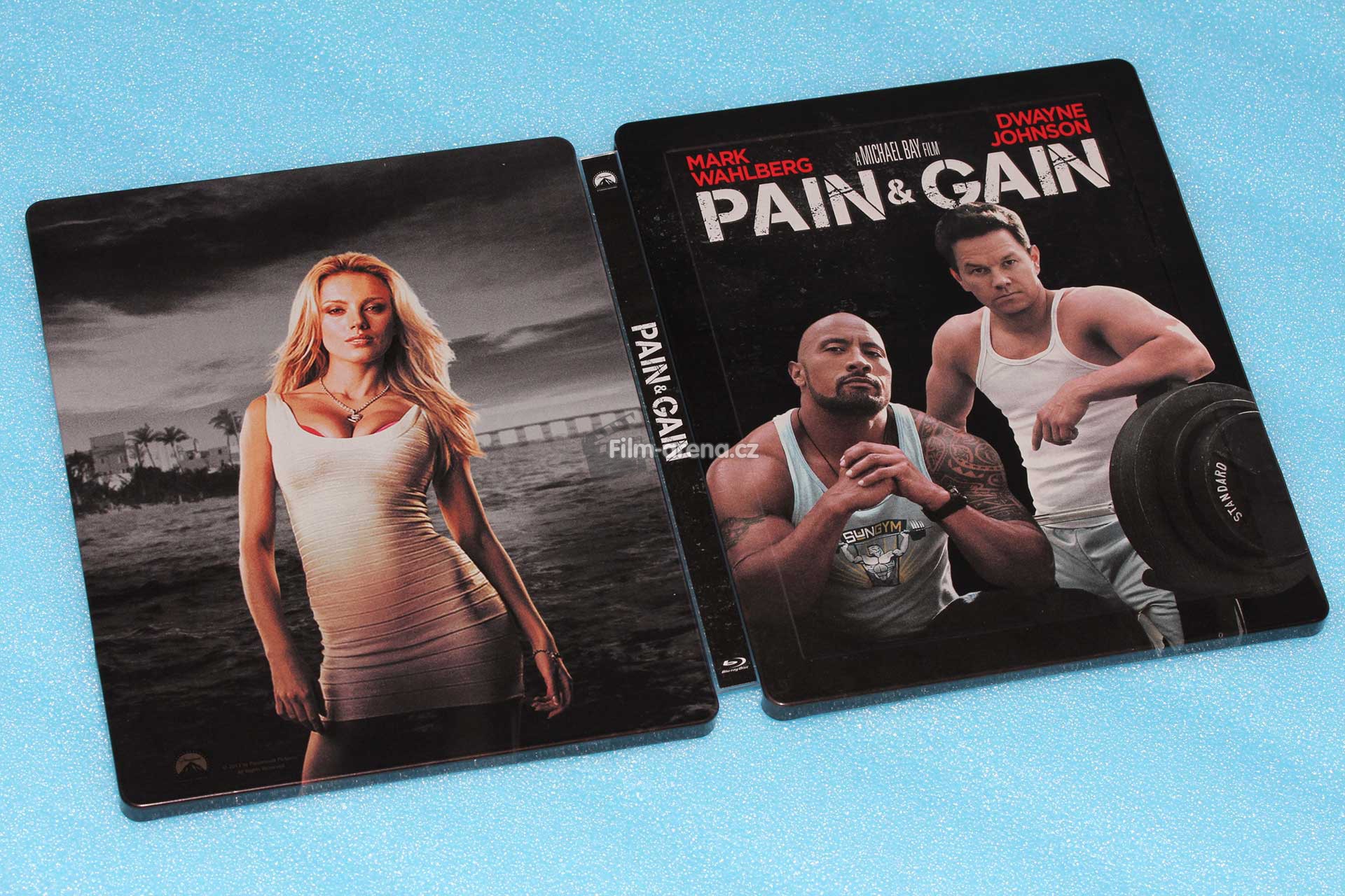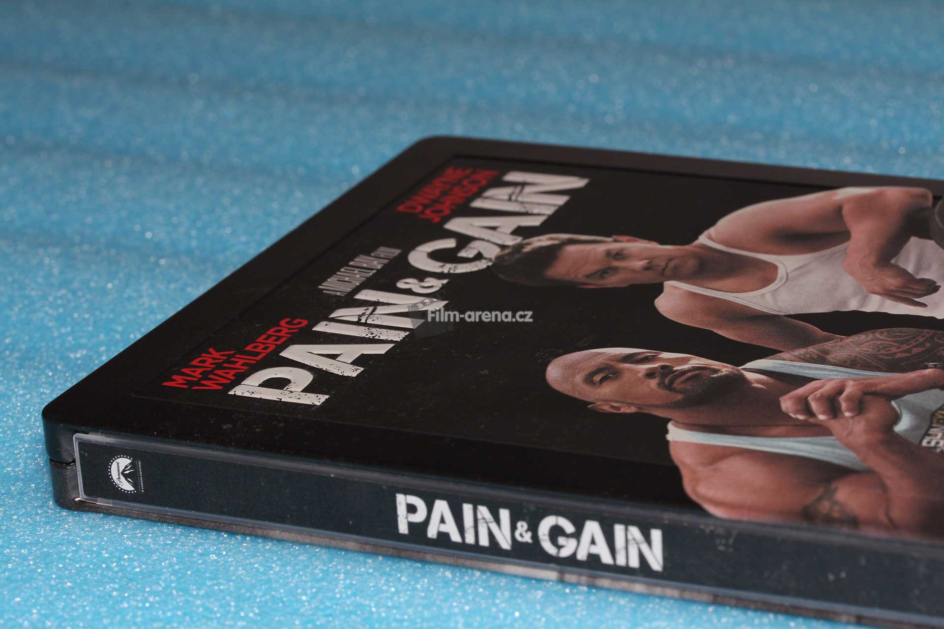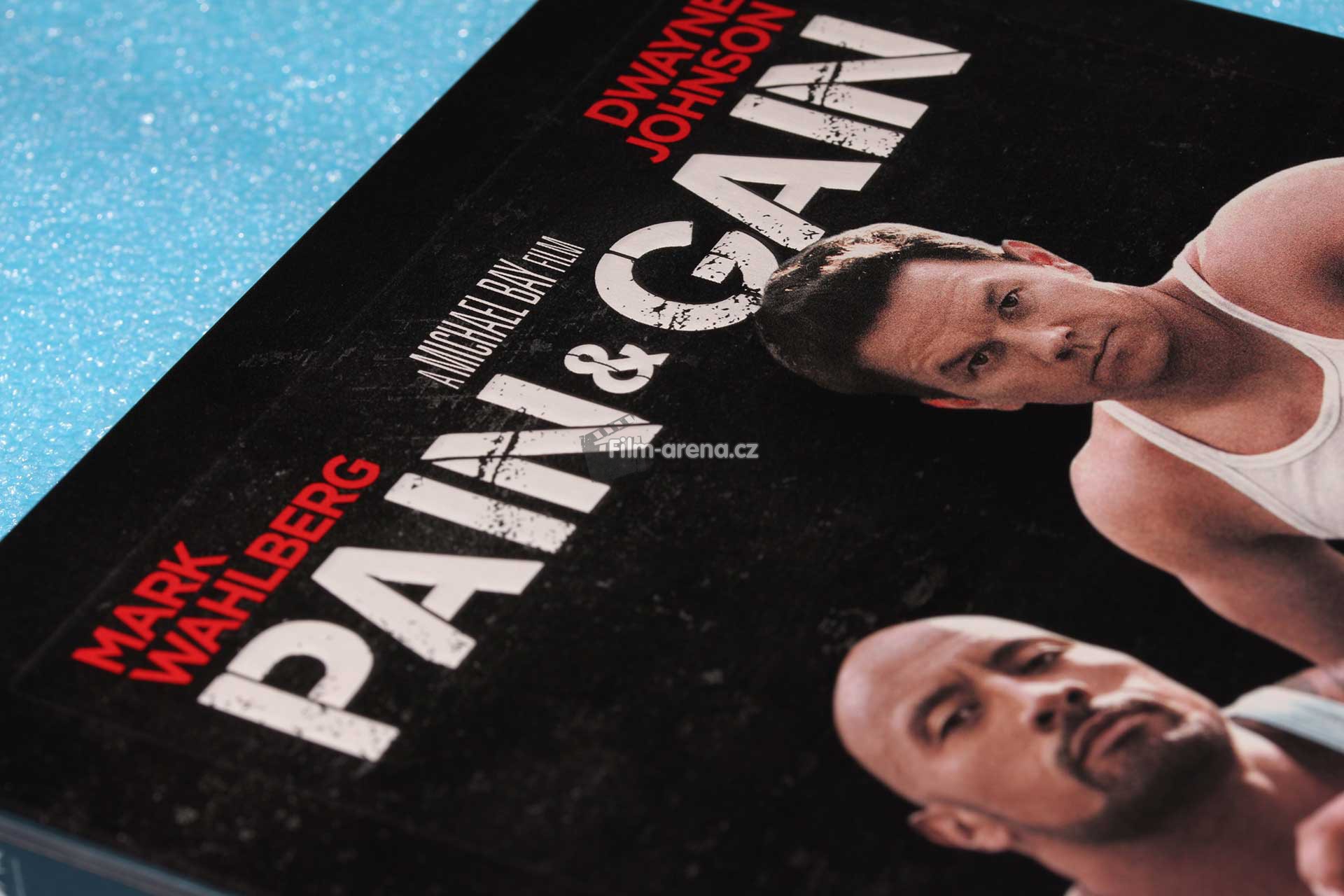 Na Steelbooku máme opět můj oblíbený debossovaný rámeček a krásně embossovaný originální název filmu „Pain and Gain“. Tento povrchový design vždy potěší u každého kousku. Bohužel někdy nepěkný deboss překvapí i u plechu, který ho vůbec nemá mít. Jistě to každý Steelbookový nadšenec zná. Přední strana je podkladem černé barvy, embossovaný název a informace o režii filmu jsou v odstínu bílé a jména dvou hlavních představitelů jsou rudé. Tady se na chvilku zastavím.
