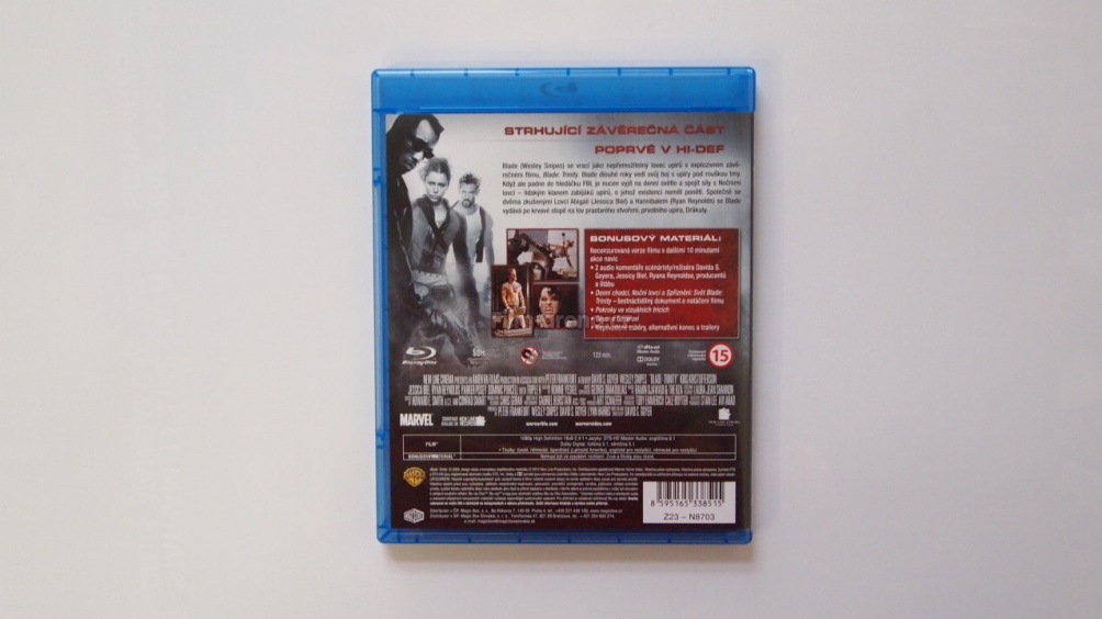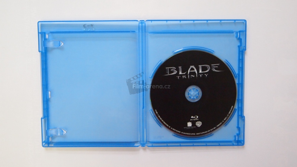 Disk je balený v modré krabičce a nejsem si vědom toho, že by se v zahraničí nacházela lepší verze, třeba steelbook. Všechny údaje jsou v pořádku. Přebal vypadá dobře, ale bohužel uvnitř opět bez potisku. Stejně tak potisk disku je obrovská nuda. Někdy si říkám, kam se podělo trochu výtvarnější vnímání filmových studií, protože černý disk s nápisem Blade Trinity mi prostě nestačí.