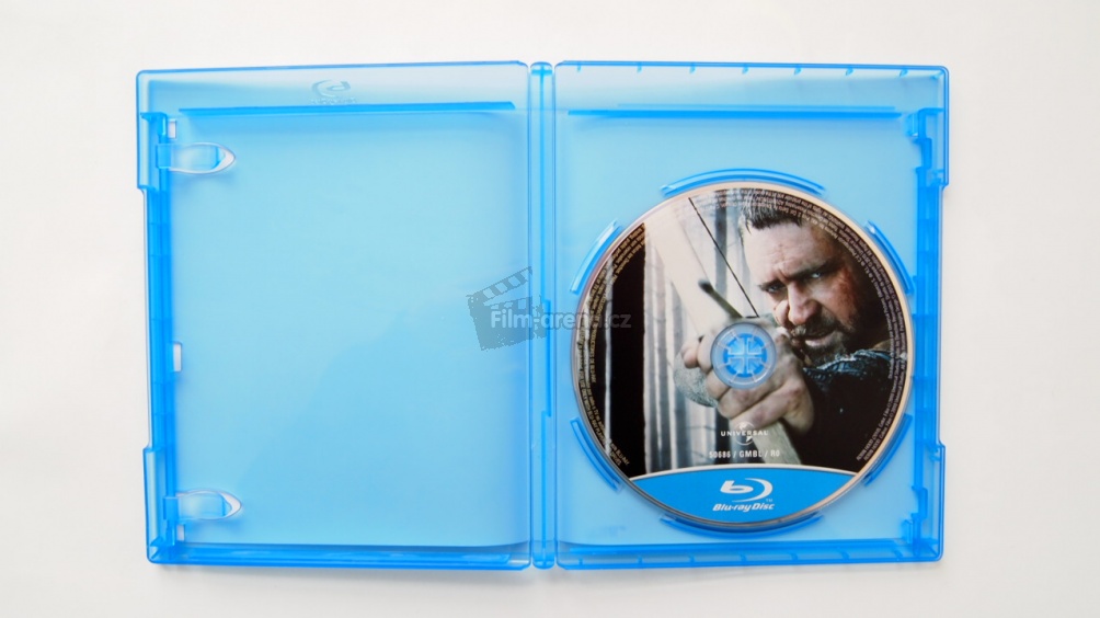 Klasická modrá Blu-ray krabička s pěkným obrázkem Robina Hooda připraveného ke střelbě z luku, vnitřní artwork opět chybí, potisk Blu-ray disku je totožný s obrázkem na obalu.